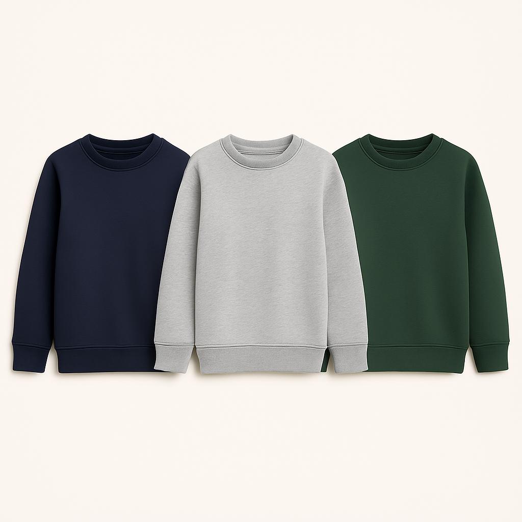 Klasik renk ve sade tasarımlarıyla okul üniformalarına kolaylıkla uyum sağlayan bu sweatshirtler, diğer okul kıyafetleriyle rahat kombinlenebilir. Yaka kısmı yuvarlak ya da hafif ribanalı olarak tasarlanmıştır, bu da kullanım kolaylığı sunar.